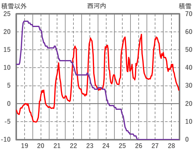 | 日 | 時 | 気温 | 降水 | 風向/風速 | 日照 | 積雪 | 降雪 |