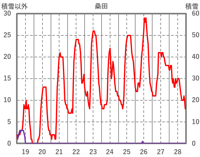 | 日 | 時 | 気温 | 降水 | 風向/風速 | 日照 | 積雪 | 降雪 |