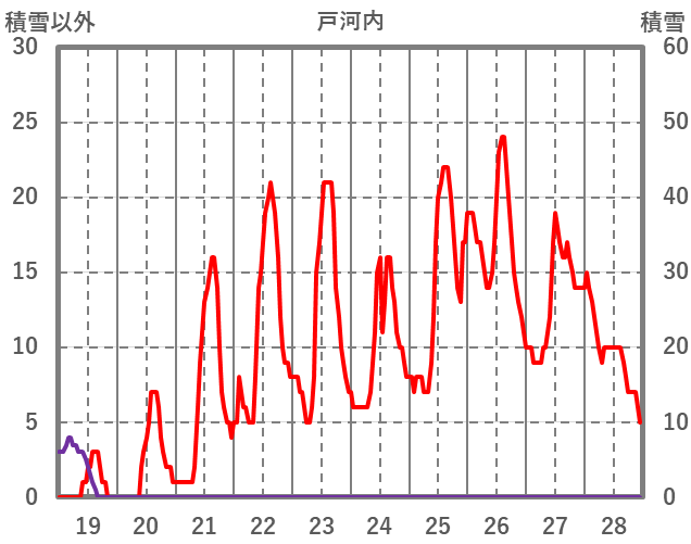 | 日 | 時 | 気温 | 降水 | 風向/風速 | 日照 | 積雪 | 降雪 |