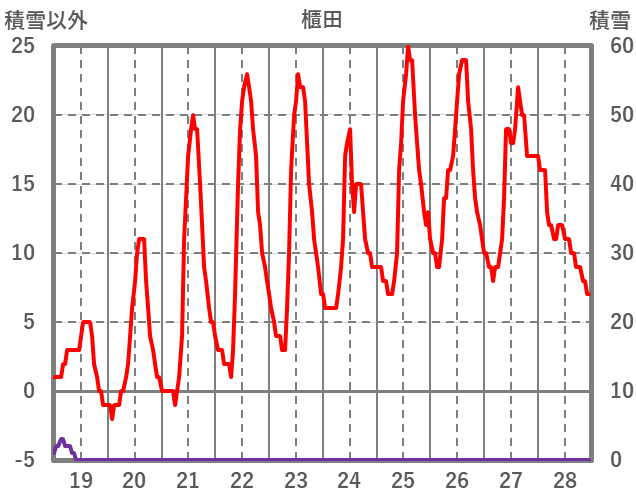 | 日 | 時 | 気温 | 降水 | 風向/風速 | 日照 | 積雪 | 降雪 |