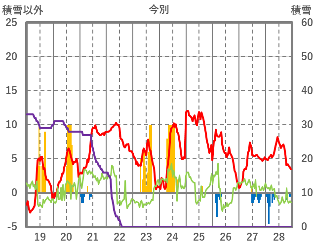 | 日 | 時 | 気温 | 降水 | 風向/風速 | 日照 | 積雪 | 降雪 |
