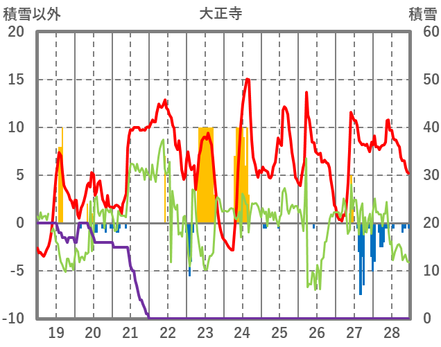 | 日 | 時 | 気温 | 降水 | 風向/風速 | 日照 | 積雪 | 降雪 |