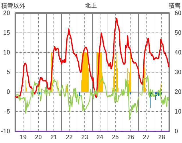 | 日 | 時 | 気温 | 降水 | 風向/風速 | 日照 | 積雪 | 降雪 |