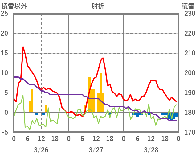| 日 | 時 | 気温 | 降水 | 風向/風速 | 日照 | 積雪 | 降雪 |