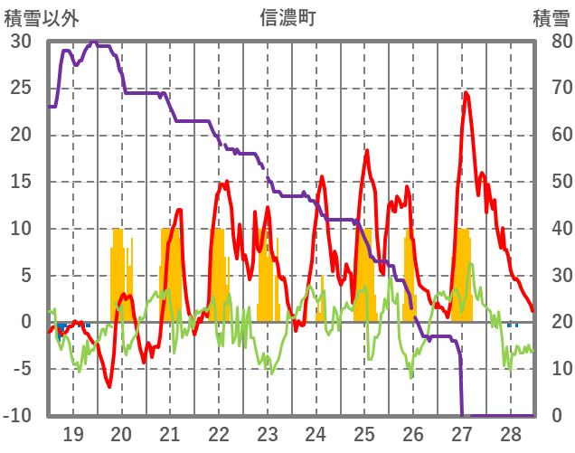 | 日 | 時 | 気温 | 降水 | 風向/風速 | 日照 | 積雪 | 降雪 |