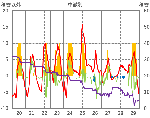 | 日 | 時 | 気温 | 降水 | 風向/風速 | 日照 | 積雪 | 降雪 |