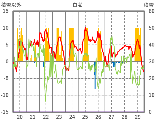 | 日 | 時 | 気温 | 降水 | 風向/風速 | 日照 | 積雪 | 降雪 |