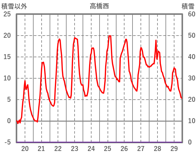 | 日 | 時 | 気温 | 降水 | 風向/風速 | 日照 | 積雪 | 降雪 |