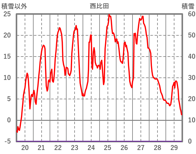 | 日 | 時 | 気温 | 降水 | 風向/風速 | 日照 | 積雪 | 降雪 |