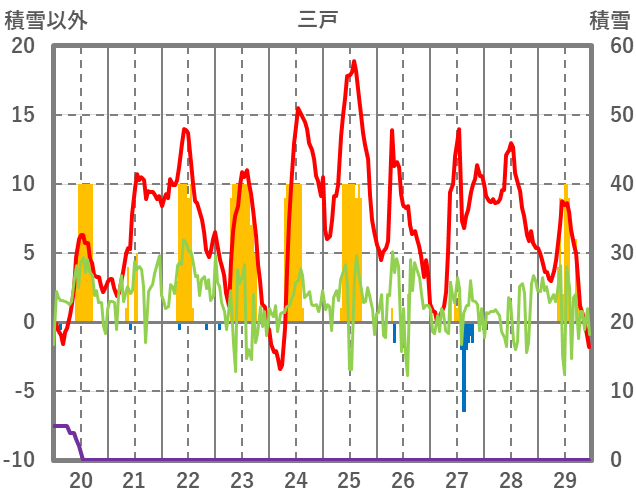 | 日 | 時 | 気温 | 降水 | 風向/風速 | 日照 | 積雪 | 降雪 |