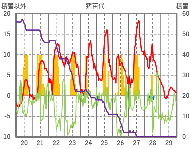| 日 | 時 | 気温 | 降水 | 風向/風速 | 日照 | 積雪 | 降雪 |