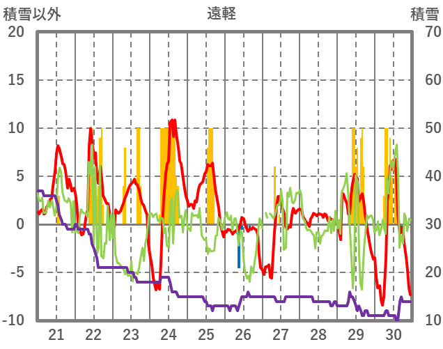 | 日 | 時 | 気温 | 降水 | 風向/風速 | 日照 | 積雪 | 降雪 |
