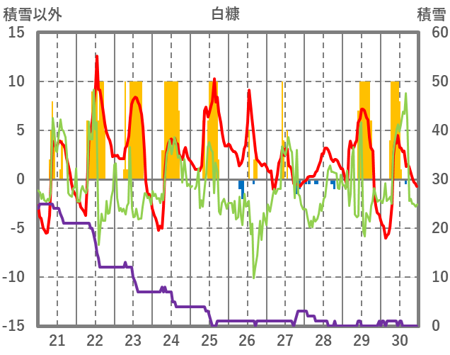 | 日 | 時 | 気温 | 降水 | 風向/風速 | 日照 | 積雪 | 降雪 |