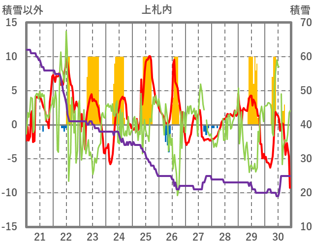 | 日 | 時 | 気温 | 降水 | 風向/風速 | 日照 | 積雪 | 降雪 |