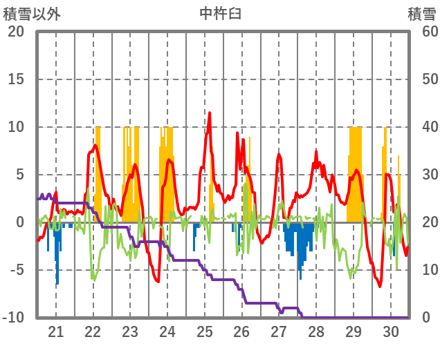 | 日 | 時 | 気温 | 降水 | 風向/風速 | 日照 | 積雪 | 降雪 |