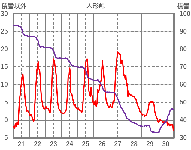 | 日 | 時 | 気温 | 降水 | 風向/風速 | 日照 | 積雪 | 降雪 |