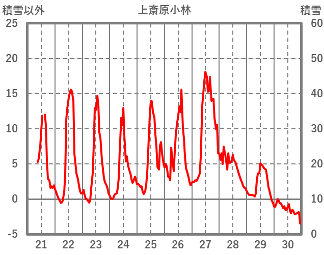 | 日 | 時 | 気温 | 降水 | 風向/風速 | 日照 | 積雪 | 降雪 |