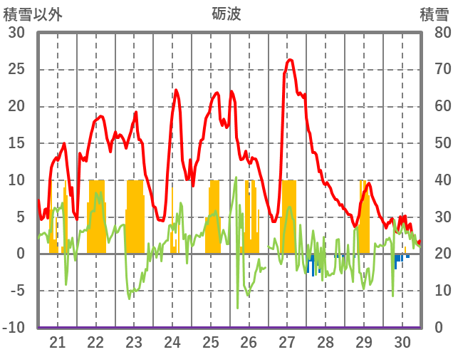 | 日 | 時 | 気温 | 降水 | 風向/風速 | 日照 | 積雪 | 降雪 |