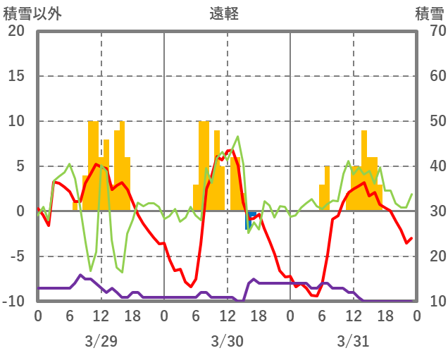 | 日 | 時 | 気温 | 降水 | 風向/風速 | 日照 | 積雪 | 降雪 |