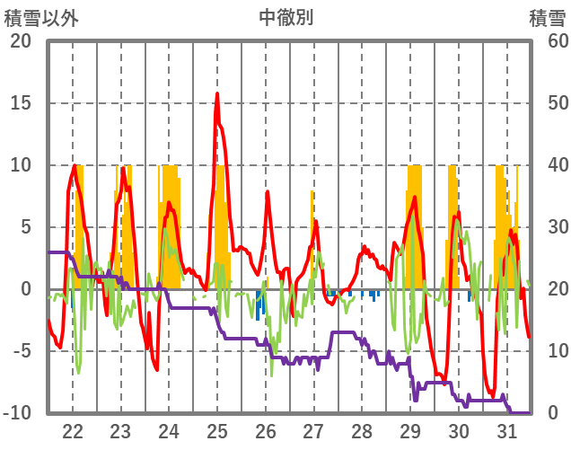 | 日 | 時 | 気温 | 降水 | 風向/風速 | 日照 | 積雪 | 降雪 |