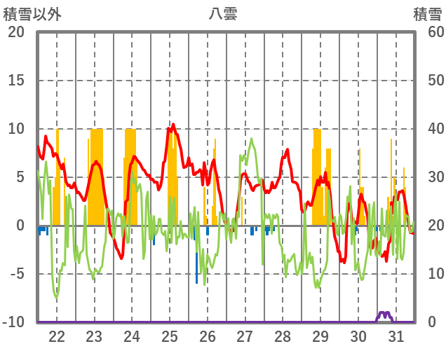 | 日 | 時 | 気温 | 降水 | 風向/風速 | 日照 | 積雪 | 降雪 |