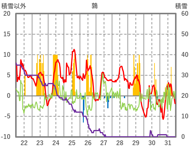 | 日 | 時 | 気温 | 降水 | 風向/風速 | 日照 | 積雪 | 降雪 |