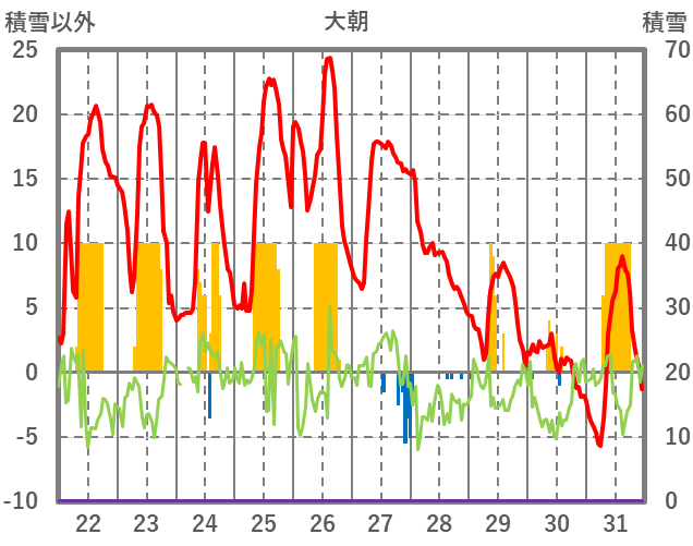 | 日 | 時 | 気温 | 降水 | 風向/風速 | 日照 | 積雪 | 降雪 |