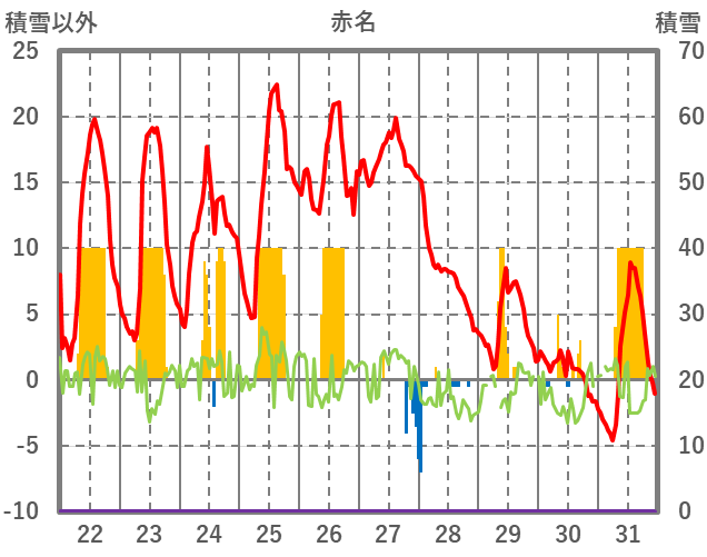 | 日 | 時 | 気温 | 降水 | 風向/風速 | 日照 | 積雪 | 降雪 |