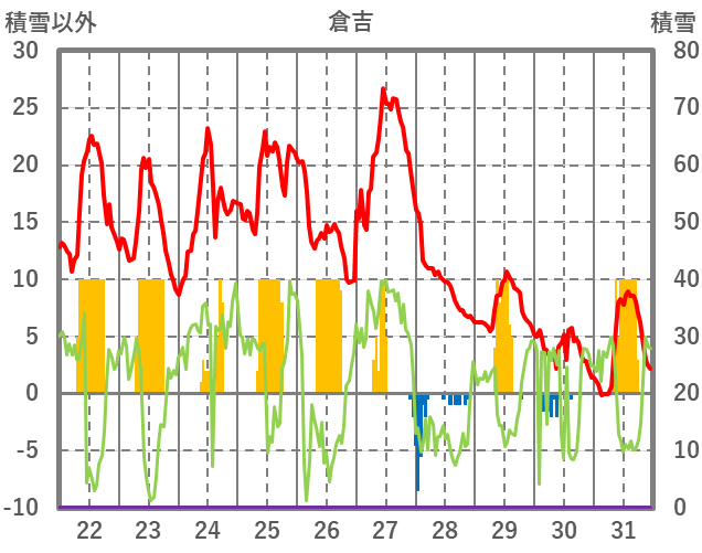 | 日 | 時 | 気温 | 降水 | 風向/風速 | 日照 | 積雪 | 降雪 |