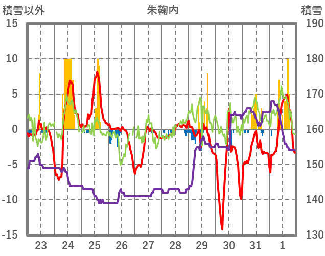 | 日 | 時 | 気温 | 降水 | 風向/風速 | 日照 | 積雪 | 降雪 |