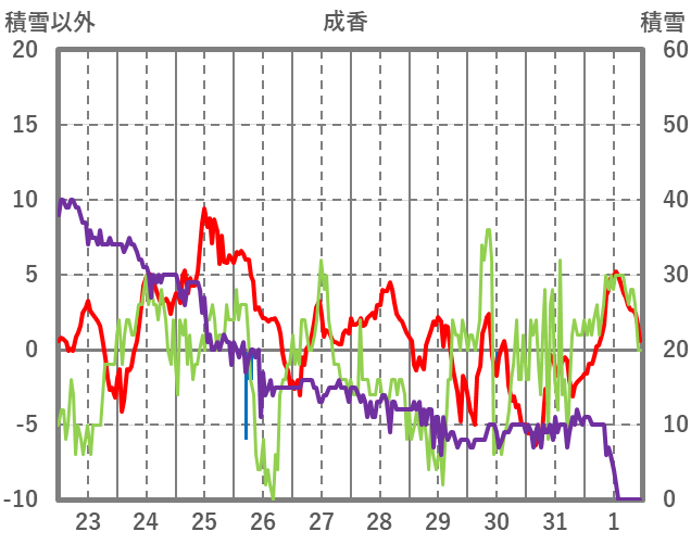 | 日 | 時 | 気温 | 降水 | 風向/風速 | 日照 | 積雪 | 降雪 |