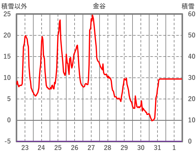 | 日 | 時 | 気温 | 降水 | 風向/風速 | 日照 | 積雪 | 降雪 |