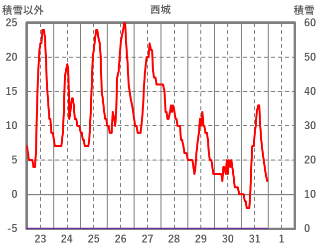 | 日 | 時 | 気温 | 降水 | 風向/風速 | 日照 | 積雪 | 降雪 |
