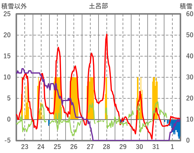 | 日 | 時 | 気温 | 降水 | 風向/風速 | 日照 | 積雪 | 降雪 |