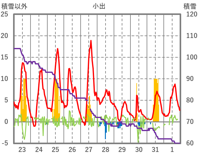 | 日 | 時 | 気温 | 降水 | 風向/風速 | 日照 | 積雪 | 降雪 |