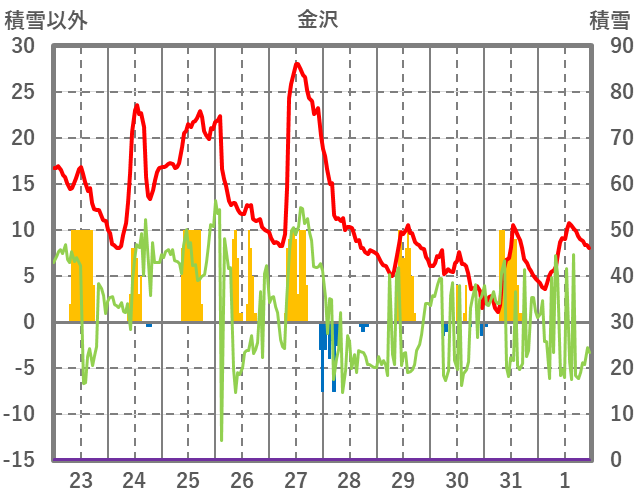 | 日 | 時 | 気温 | 降水 | 風向/風速 | 日照 | 積雪 | 降雪 |