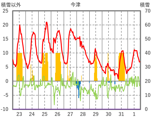 | 日 | 時 | 気温 | 降水 | 風向/風速 | 日照 | 積雪 | 降雪 |
