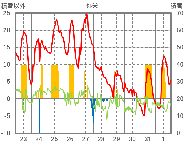 | 日 | 時 | 気温 | 降水 | 風向/風速 | 日照 | 積雪 | 降雪 |