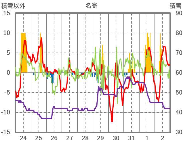 | 日 | 時 | 気温 | 降水 | 風向/風速 | 日照 | 積雪 | 降雪 |