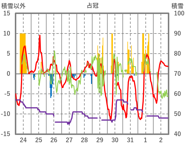 | 日 | 時 | 気温 | 降水 | 風向/風速 | 日照 | 積雪 | 降雪 |
