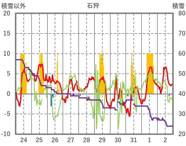 | 日 | 時 | 気温 | 降水 | 風向/風速 | 日照 | 積雪 | 降雪 |