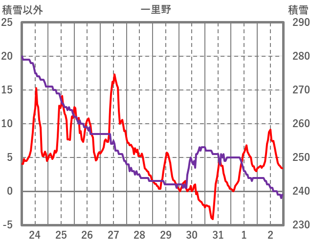 | 日 | 時 | 気温 | 降水 | 風向/風速 | 日照 | 積雪 | 降雪 |