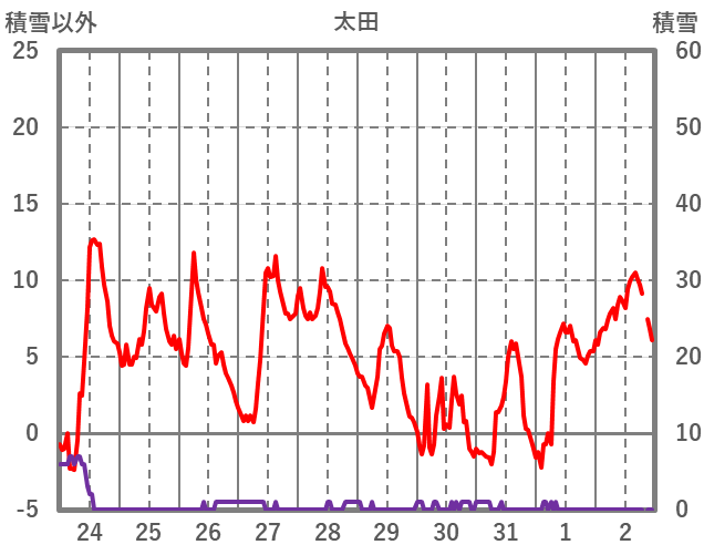 | 日 | 時 | 気温 | 降水 | 風向/風速 | 日照 | 積雪 | 降雪 |