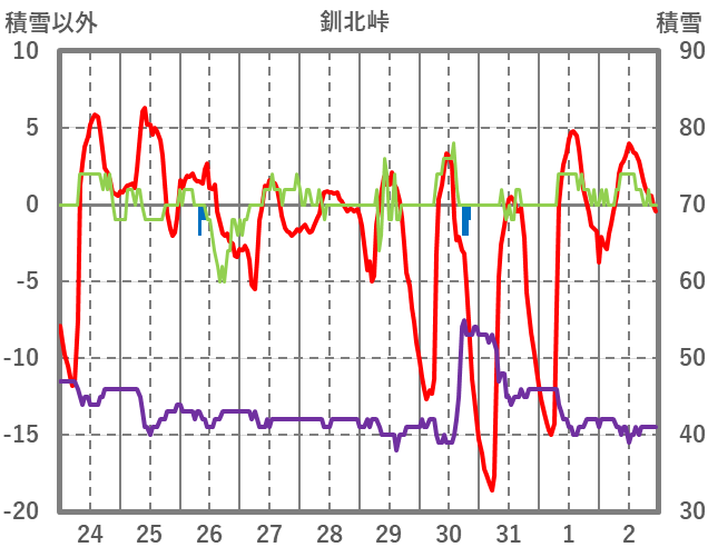 | 日 | 時 | 気温 | 降水 | 風向/風速 | 日照 | 積雪 | 降雪 |