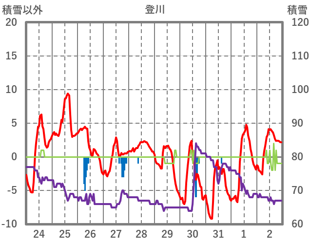 | 日 | 時 | 気温 | 降水 | 風向/風速 | 日照 | 積雪 | 降雪 |