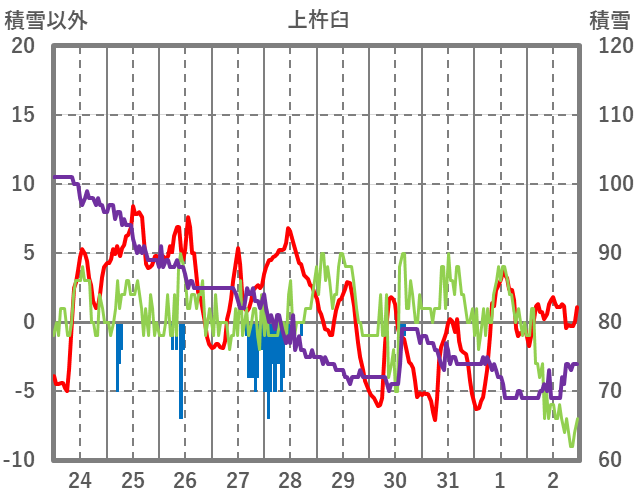 | 日 | 時 | 気温 | 降水 | 風向/風速 | 日照 | 積雪 | 降雪 |