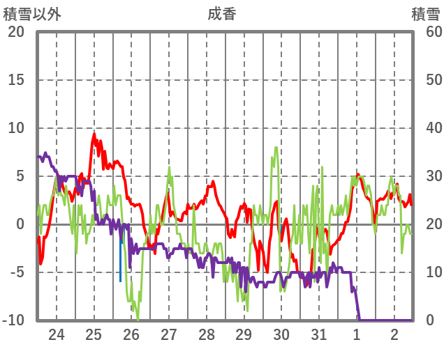 | 日 | 時 | 気温 | 降水 | 風向/風速 | 日照 | 積雪 | 降雪 |