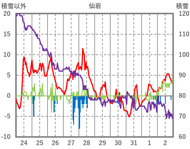 | 日 | 時 | 気温 | 降水 | 風向/風速 | 日照 | 積雪 | 降雪 |