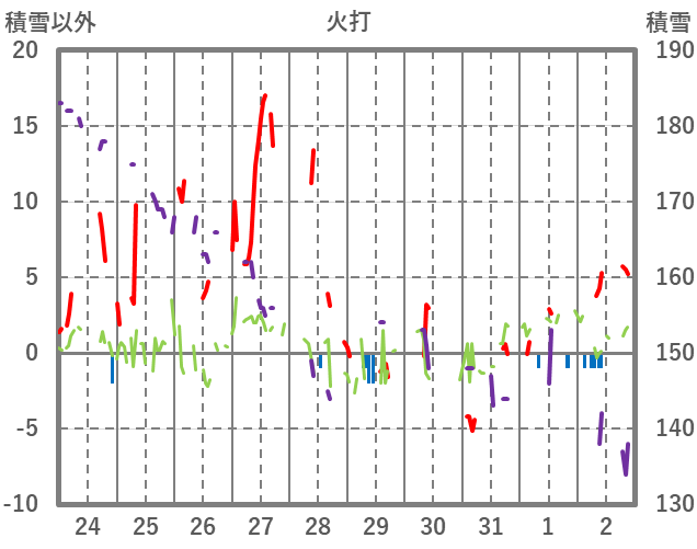| 日 | 時 | 気温 | 降水 | 風向/風速 | 日照 | 積雪 | 降雪 |