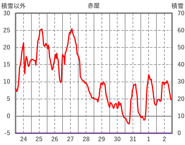 | 日 | 時 | 気温 | 降水 | 風向/風速 | 日照 | 積雪 | 降雪 |